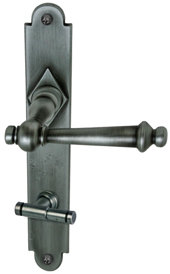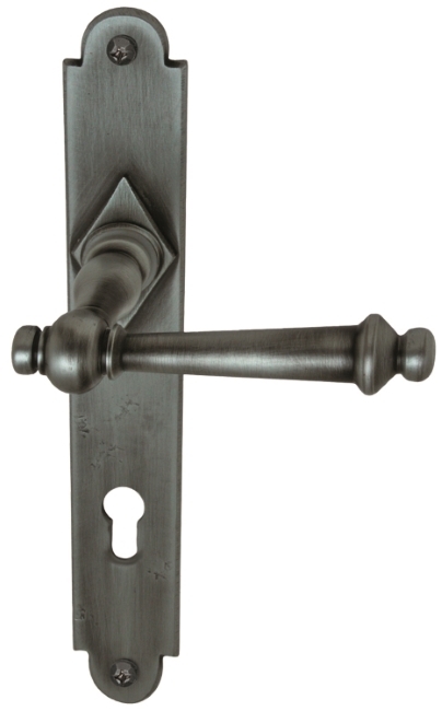 Utrzymany w kolorze czernionej, satynowanej stali zestaw do drzwi pokojowych od razu rzuca się w oczy dzięki swojemu rustykalnemu stylowi. Tarcza długa ma na obu końcach dyskretne zaokrąglenia . Elegancko zdobiona klamka przechodzi w rombowy element na tarczy długiej.