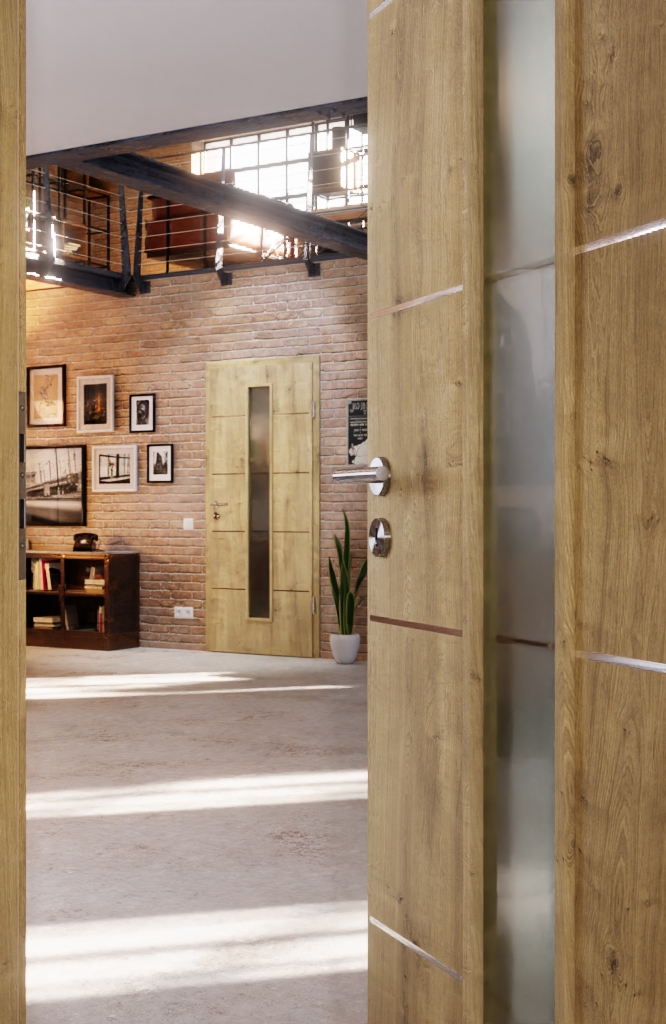 Te drzwi łączą w sobie dwa elementy: z jednej strony naturalny dekor dębowy emanuje rustykalnym urokiem. Z drugiej strony wąski otwór świetlny pośrodku wprowadza nieco jasności do Twojego pomieszczenia. Jako łącznik między tymi dwoma składnikami pełnią cztery poziome paski.