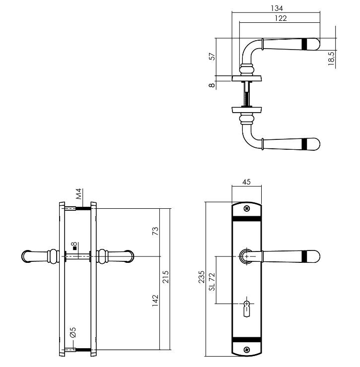Klasyczny szyld jest lekko zaokrąglony na końcach i ozdobiony delikatnymi frezowaniami, które znajdują się również na L-kształtnym klamce. Te piękne detale i matowa powierzchnia tworzą elegancki antyczny wygląd, który pasuje zarówno do klasycznych, jak i nowoczesnych drzwi.