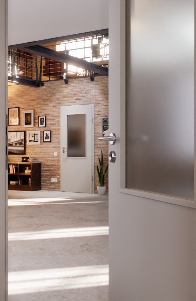 Dodatkowe cechy dopełniają funkcjonalny design: Górna część drzwi pozwala zajrzeć do pomieszczenia - dolna jest chroniona przed stłuczeniem szkła dzięki podwyższonej pozycji otworu świetlnego.