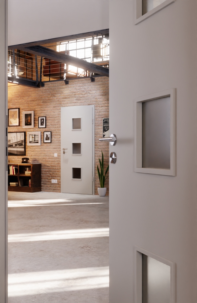 Te trzy otwory świetlne w środkowej części drzwi zapewniają bogate światło w Twoim pomieszczeniu oraz widok na przeciwległą stronę. Ochrona przed stłuczeniem szkła w dolnej części drzwi to kolejna pozytywna cecha.