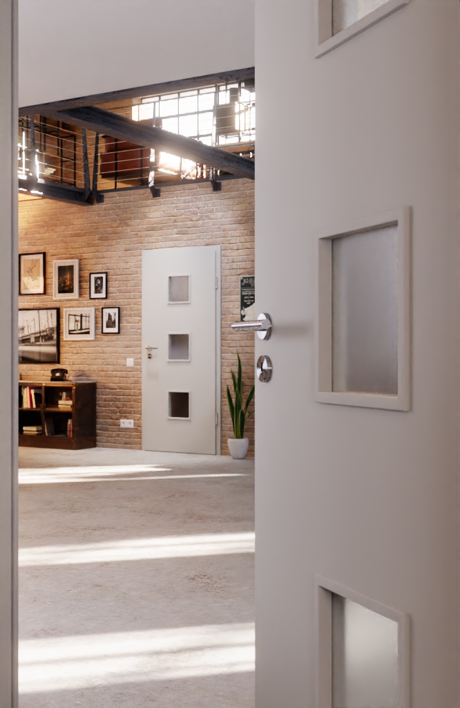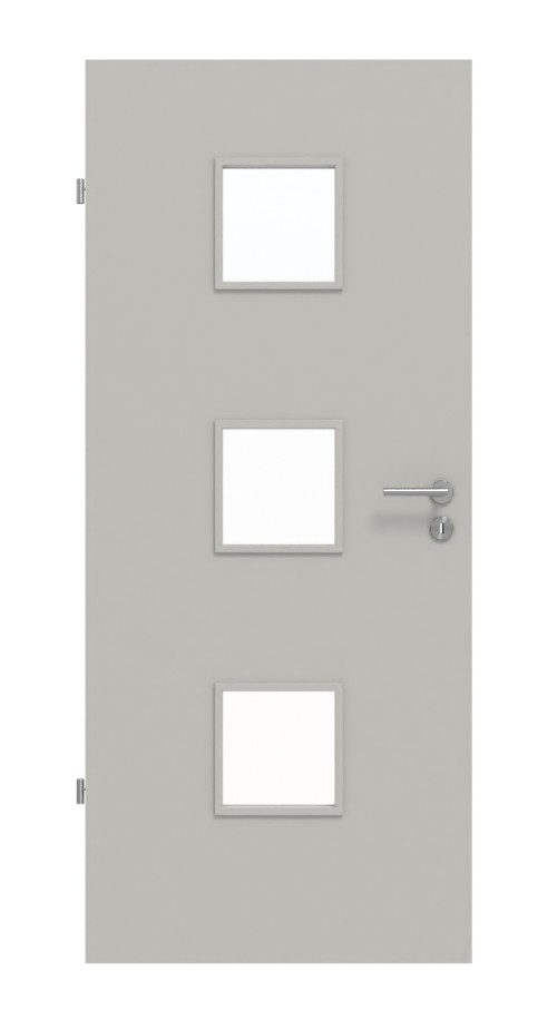 Prostokątny przeszklenie z nałożonymi listwami szklanymi tworzy nowoczesną atmosferę. Jako trzy nałożone na siebie przeszklenia zdobią środek Twoich drzwi wewnętrznych, zapewniając dużą żywotność. Rozmieszczenie spełnia trzy ważne funkcje: wystarczającą ilość światła, możliwy widok na zewnątrz oraz ochronę dolnej części drzwi przed uszkodzeniem.