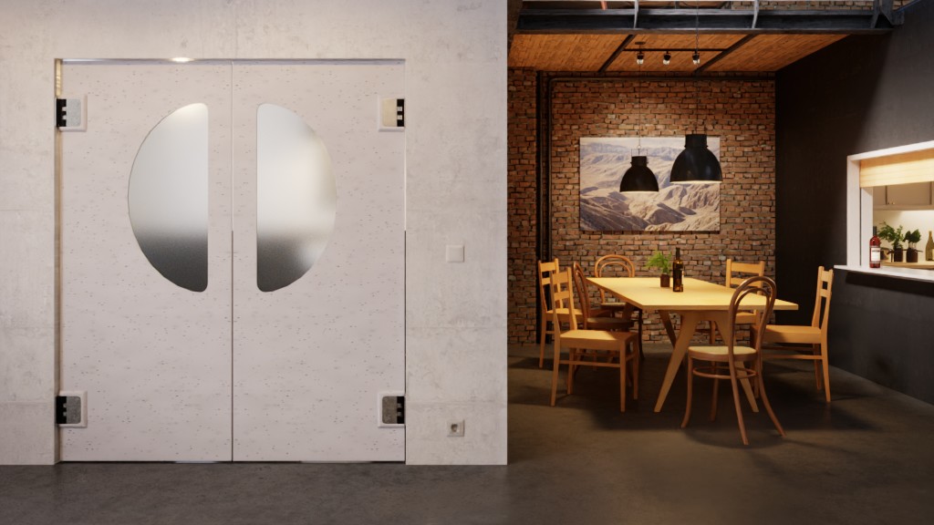 Dynamiczna drzwi wahadłowe z tworzywa sztucznego z przeszkleniem i zaokrąglonymi krawędziami: