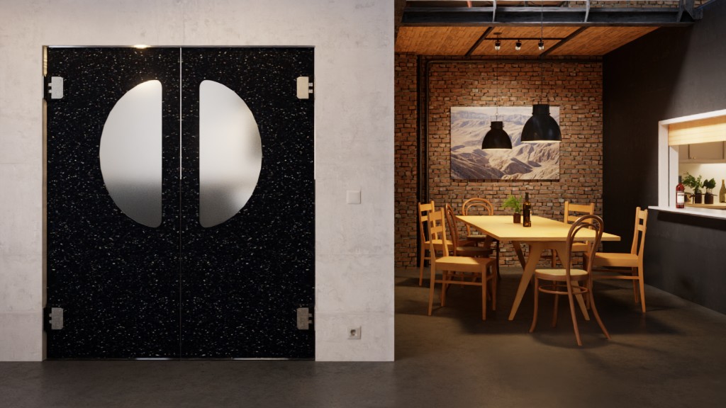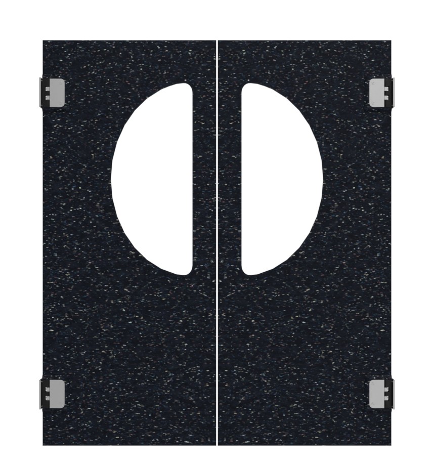 Drzwi wahadłowe charakteryzują się solidnością, ponieważ wykonane są z 15 mm grubej, łamliwej polietylenu i mają zaokrąglone krawędzie. Wbudowane na poziomie powierzchni akrylowe przeszklenia również mają 15 mm grubości.