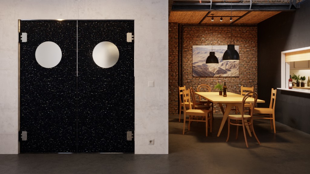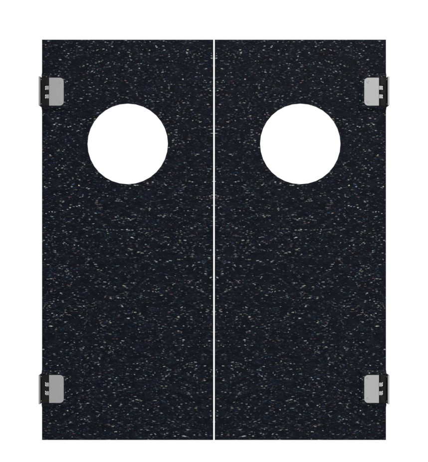 Drzwi wahadłowe wykonane są z łamliwego polietylenu. Grubość skrzydła drzwi wynosi 15 mm - w tym zaokrąglona krawędź skrzydła. Wbudowane akrylowe przeszklenia mają również grubość 15 mm.
