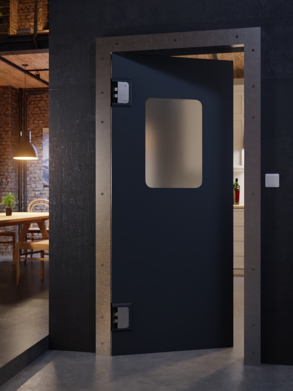 W standardzie drzwi są w kolorze RAL 7016. Masz jednak możliwość wyboru innego koloru powierzchni za dodatkową opłatą. Prostokątne przeszklenie zapewnia widoczność i jednocześnie wpuszcza wystarczającą ilość światła.
