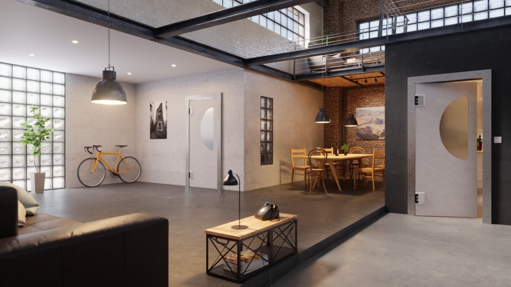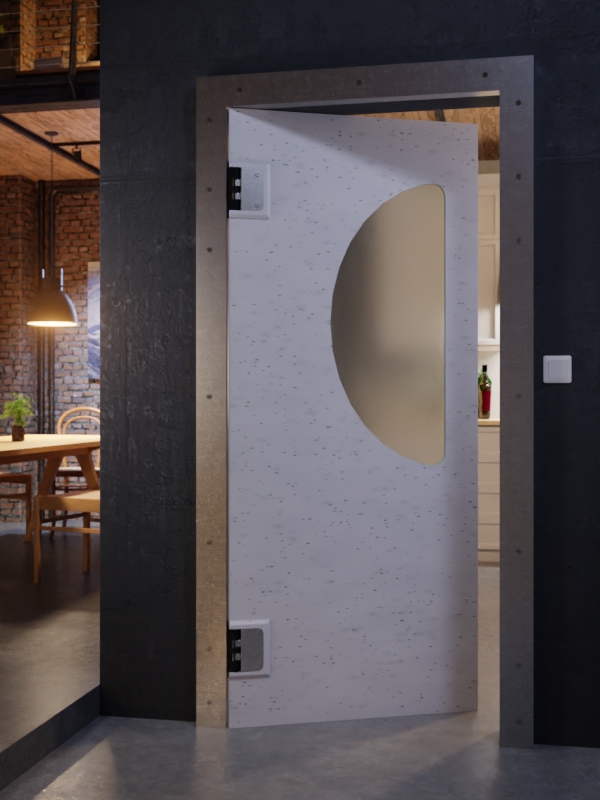 Dynamiczna drzwi wahadłowe z tworzywa sztucznego z przeszkleniem i zaokrąglonymi krawędziami:
