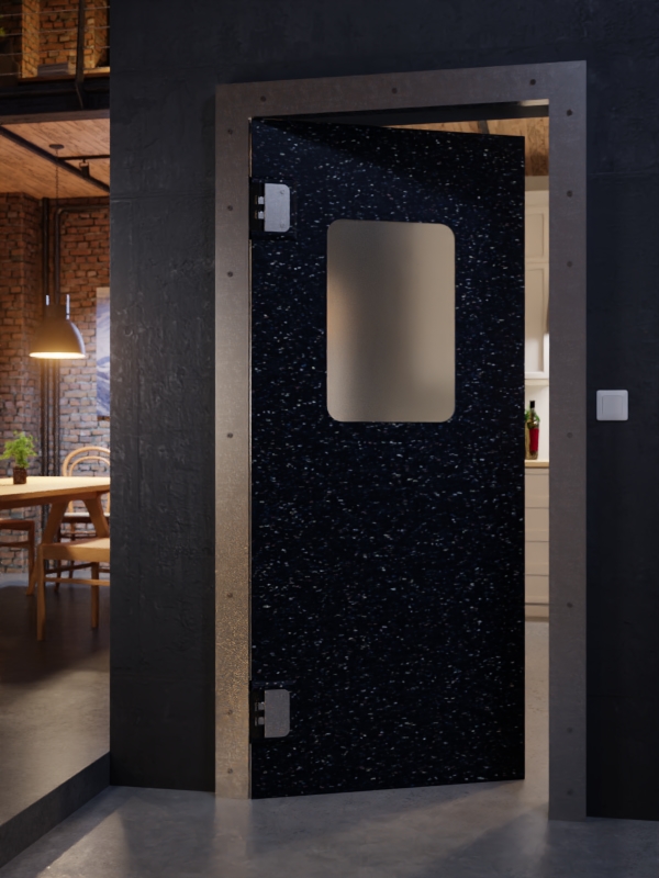 Drzwi wahadłowe wykonane są z łamliwego polietylenu. Grubość skrzydła drzwi wynosi 15 mm - w tym zaokrąglona krawędź skrzydła. Wbudowane szkło akrylowe również ma grubość 15 mm.