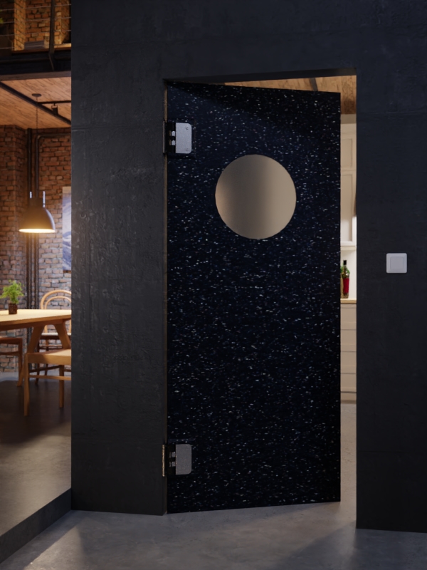 Czarna powierzchnia jest akcentowana żywymi kolorowymi punktami, co tworzy fascynujący design. Dzięki okrągłemu otworowi szklanym wpuszcza światło. Umożliwia również zajrzenie do drugiego pomieszczenia.
