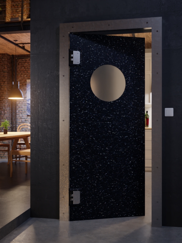 Czarna powierzchnia jest przetykana żywymi, kolorowymi punktami, które tworzą fascynujący design. Dzięki okrągłemu otworowi szklanym możesz zajrzeć do drugiego pomieszczenia. Dodatkowo wpuszcza to światło.
