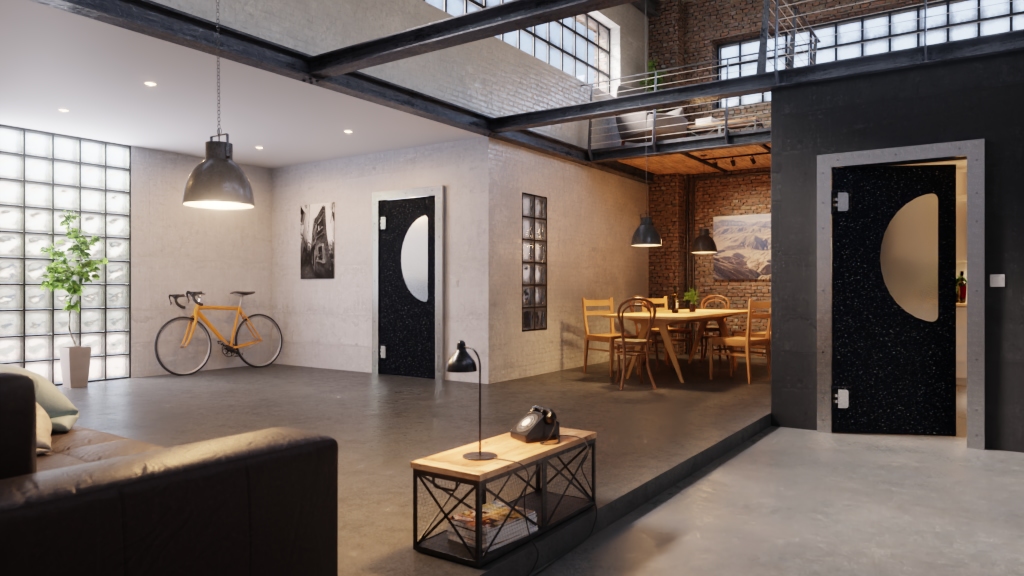 Czarna powierzchnia jest akcentowana żywymi kolorowymi punktami, co tworzy fascynujący design. Półokrągłe szklane otwarcie tworzy fascynujące wpuszczenie światła. Dodatkowo pozwala na podgląd do sąsiedniego pomieszczenia.