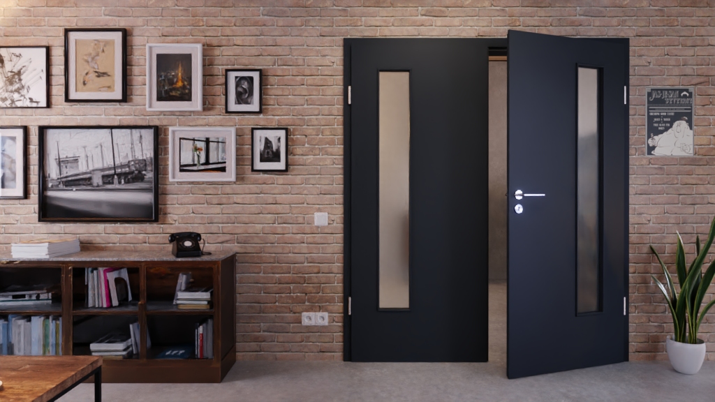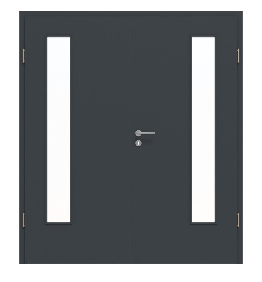 Po stronie zawiasów każdego skrzydła drzwi znajduje się wąski przeszklenie.