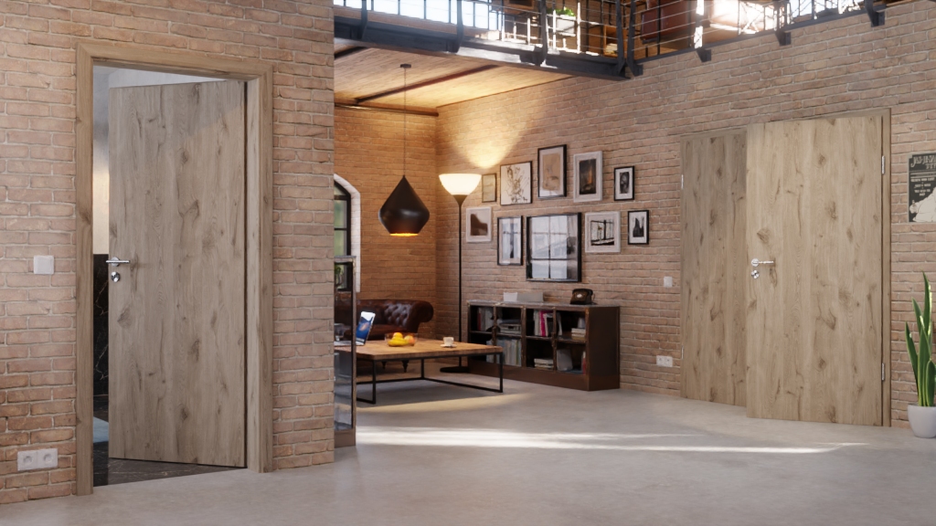 Trwałe drzwi podwójne ProLine w kolorze dębu północnego, w tym płyta wiórowa i dwuczęściowe zawiasy, które zapewniają stabilność: