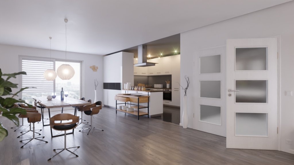 Trzy prostokątne okna świetlne rozciągają się niemal na całej powierzchni każdego skrzydła drzwi. Dzięki temu wpada dużo światła, co przyczynia się do harmonijnej atmosfery.