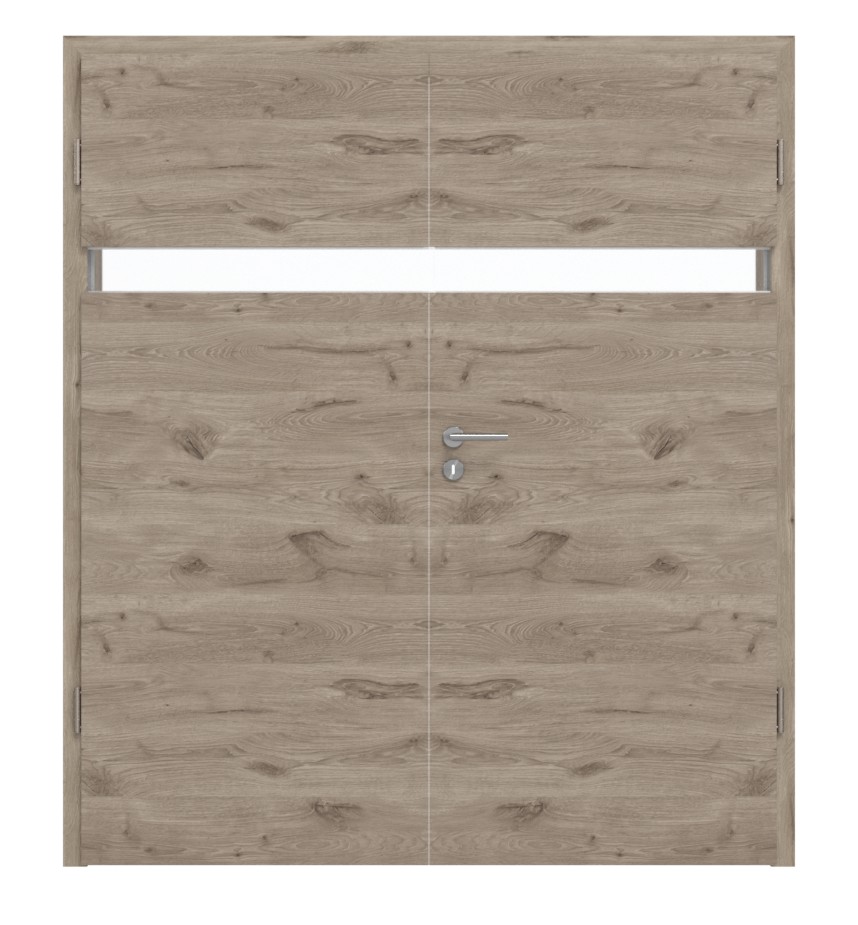Widoczne słoje nadają skrzydłu drzwi w poziomej optyce niepowtarzalny charakter. Na wysokości oczu biegnie poziome pasmo świetlne na całej szerokości.