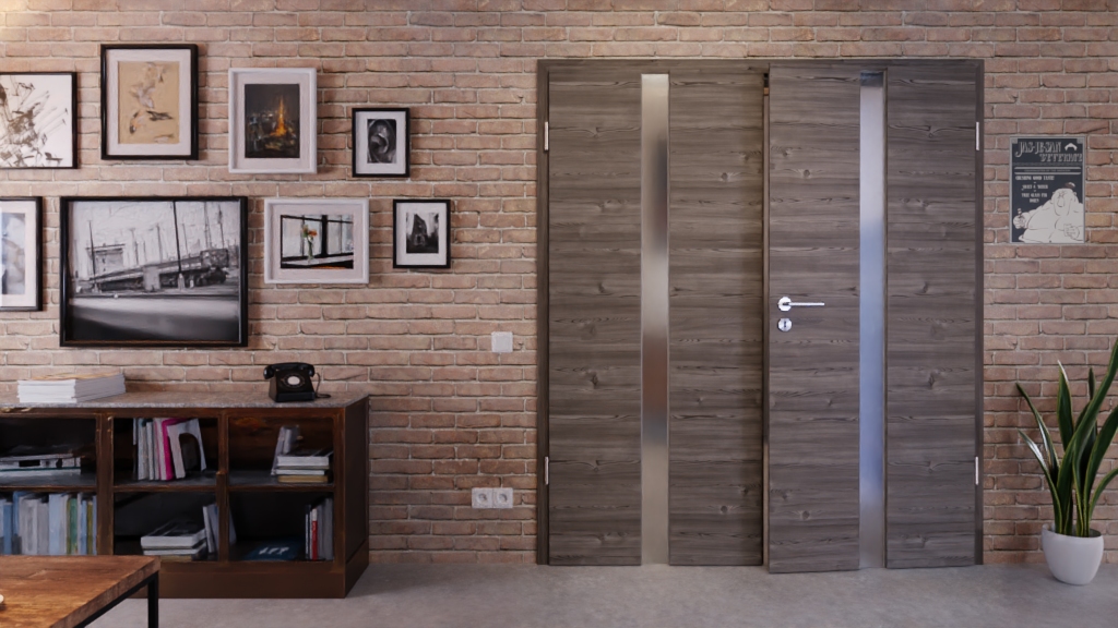 Dzięki ciemnemu odcieniowi drewna w wyglądzie poziomym Państwa przestrzeń zyskuje ciepły klimat. W środku każdego skrzydła drzwi znajduje się pas świetlny na całej wysokości.