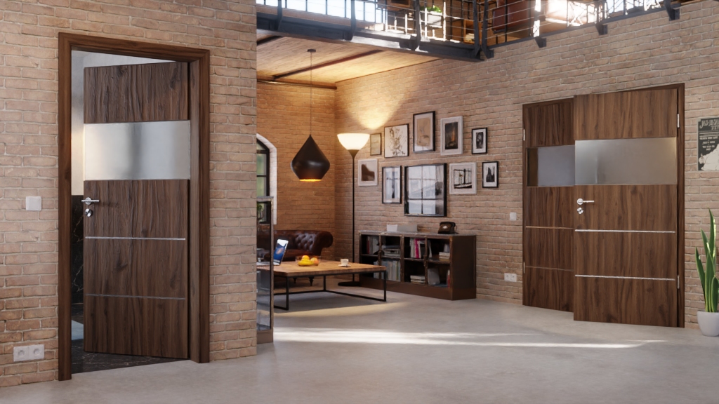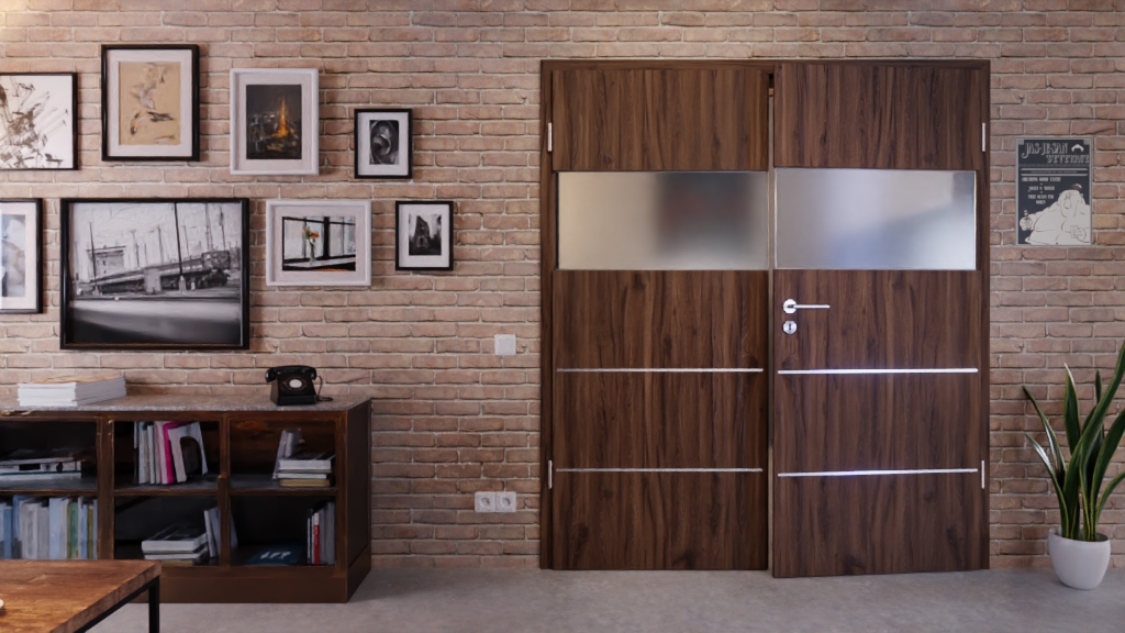 Ciemny kolor drewna emanuje spokojem i tworzy przytulną atmosferę. Na wysokości oczu znajduje się duża szyba, przez którą do wnętrza wpada dużo światła. Na dolnej części każdego skrzydła drzwi znajdują się dwie aplikacje ze stali nierdzewnej, które nadają modelowi elegancki wygląd.