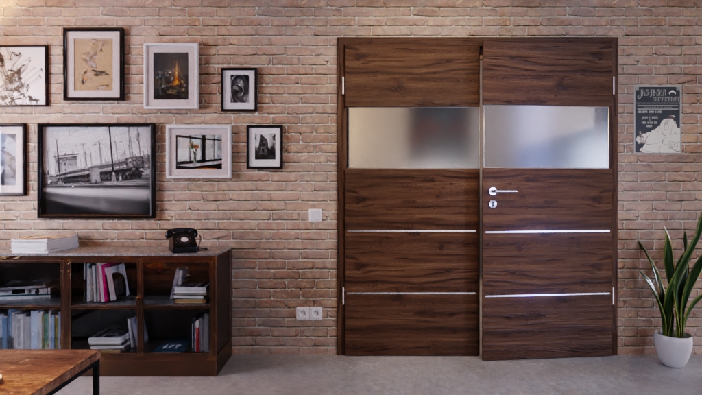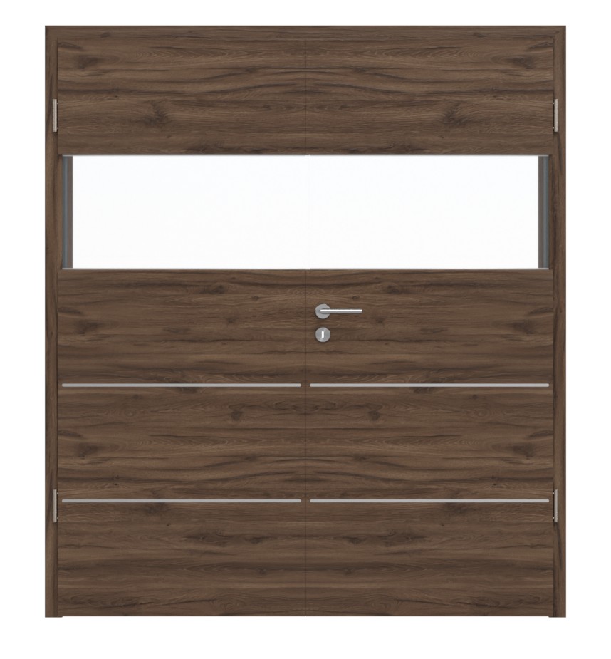 Ciemny kolor drewna w układzie poziomym emanuje spokojem i tworzy przytulną atmosferę. Na wysokości oczu znajduje się duża szyba, przez którą do Twojego wnętrza wpada dużo światła. Na dolnej części każdego skrzydła drzwi znajdują się dwa stalowe aplikacje, które nadają modelowi elegancki wygląd.