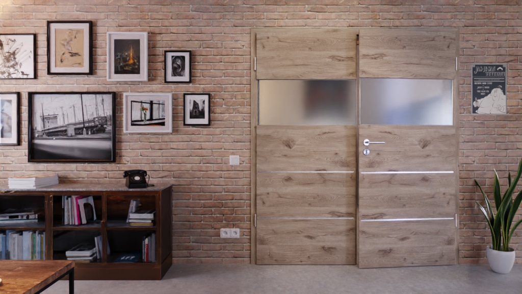 Widoczne usłojenie tworzy unikalny panel drzwiowy w poziomej optyce. Na wysokości oczu znajduje się duża szyba, przez którą do wnętrza wpada dużo światła. Na dolnej części każdego panelu drzwiowego znajdują się dwie aplikacje ze stali nierdzewnej, które nadają modelowi elegancki wygląd.