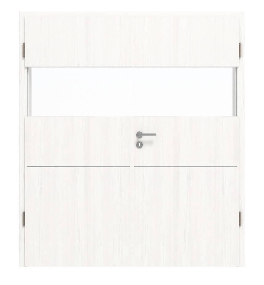 Wytłoczona struktura nadaje białemu, naturalnemu dekorowi szczególną autentyczność. Pasek świetlny, który znajduje się na wysokości oczu obu skrzydeł drzwi i przebiega na całej szerokości drzwi, wprowadza otwartą atmosferę mieszkalną. W środku obu skrzydeł drzwi znajduje się pozioma, licowa aplikacja.