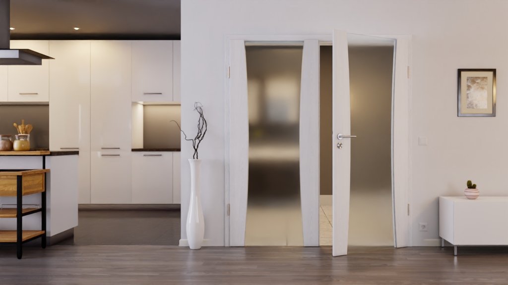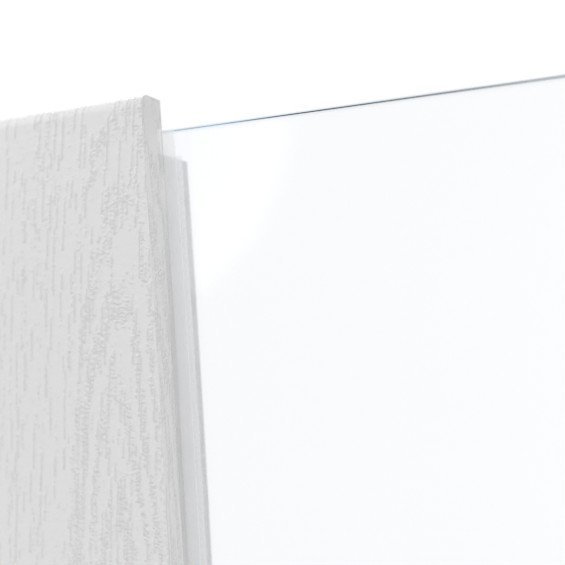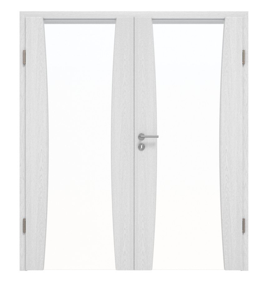 Na powierzchni widoczne są naturalne usłojenia. Białe dekory jesionowe w połączeniu z dwoma szklanymi powierzchniami pośrodku obu skrzydeł drzwi nadają otwarty i przyjazny wygląd. Zaokrąglony kształt szklanych powierzchni stanowi wizualny akcent.
