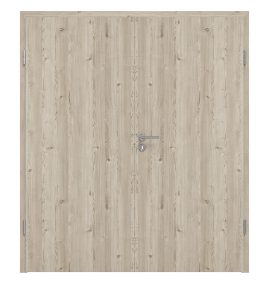 Robustne drzwi podwójne ProLine w jasnym szczotkowanym modrzewiu, w tym płyta wiórowa i dwuczęściowe zawiasy: