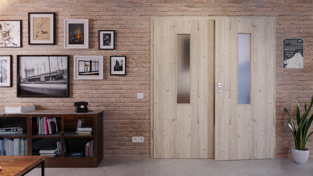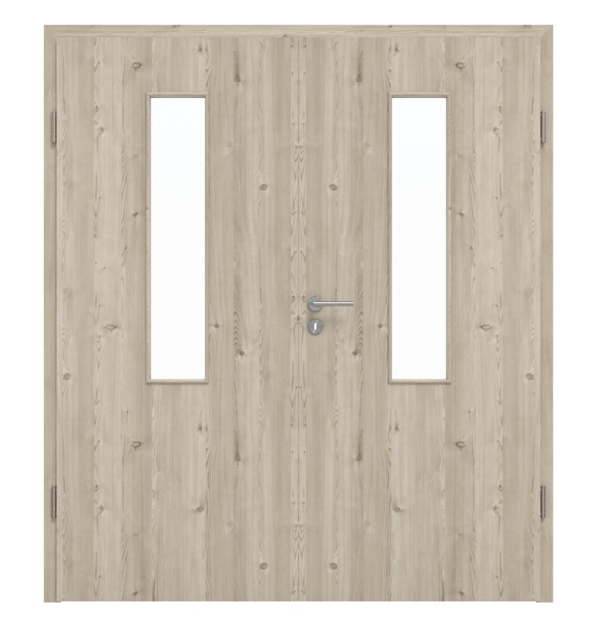 Trwałe drzwi podwójne ProLine w jasnym szczotkowanym modrzewiu, w tym płyta pełna i 3-częściowe zawiasy, które zapewniają stabilność: