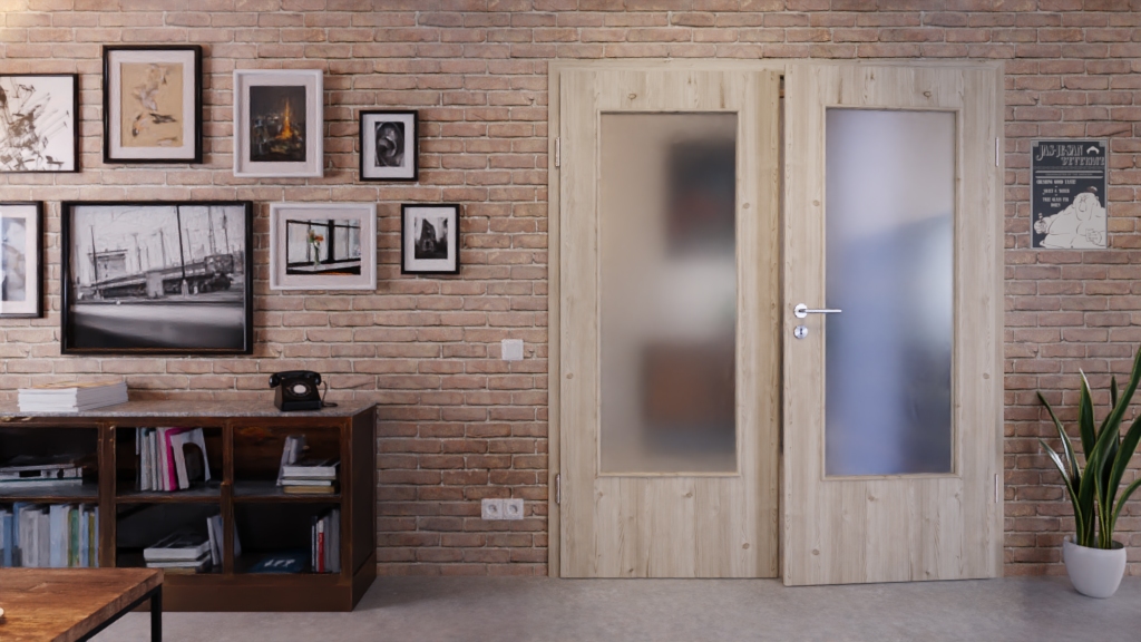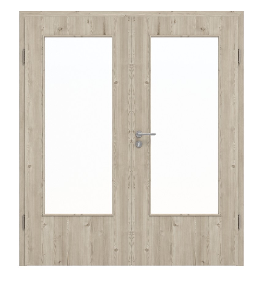 Trwałe drzwi podwójne ProLine w jasnym szczotkowanym świerku z solidną płytą pełnoobwodową i trzema zawiasami: