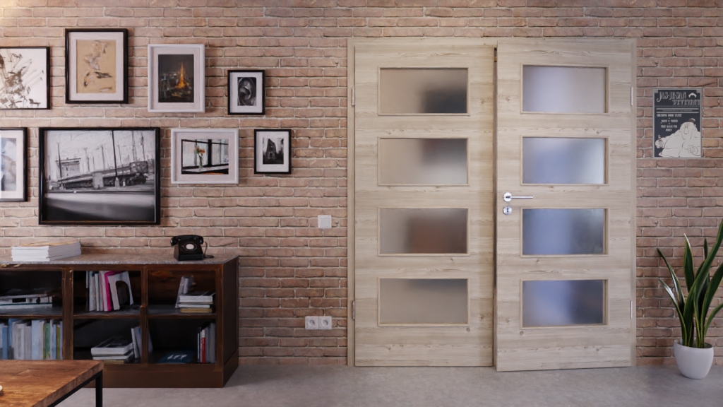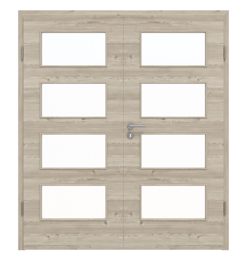 Trwałe drzwi podwójne ProLine w jasnym, szczotkowanym świerku z poziomymi pasami i pełną płytą jako rdzeń drzwi: