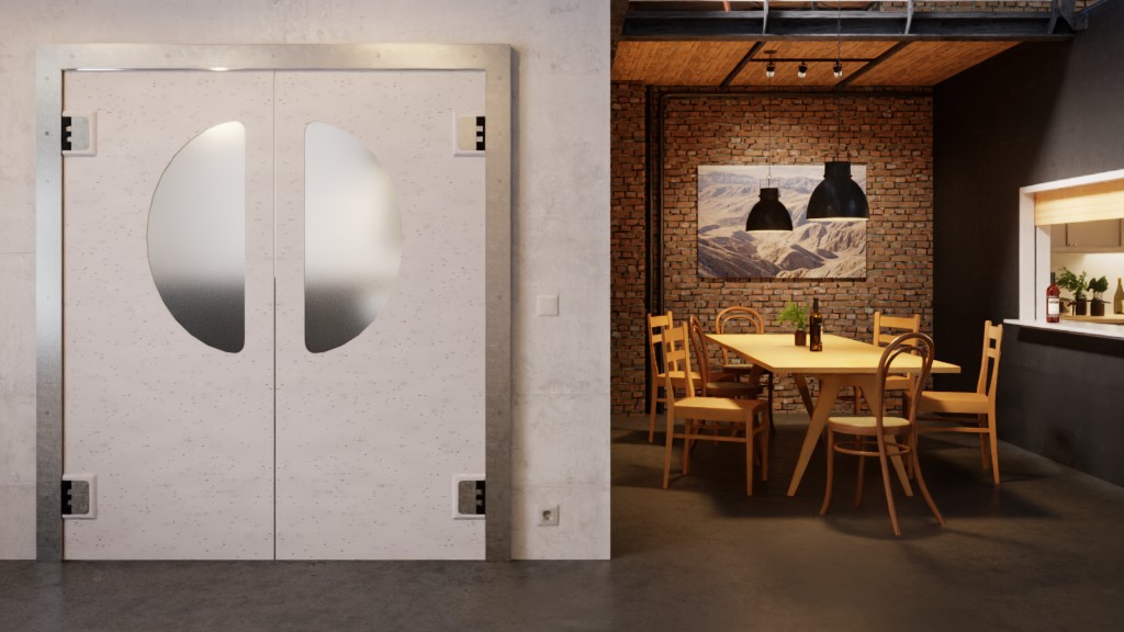 Nowoczesne drzwi wahadłowe z tworzywa sztucznego z przeszkleniem i zaokrąglonymi krawędziami: