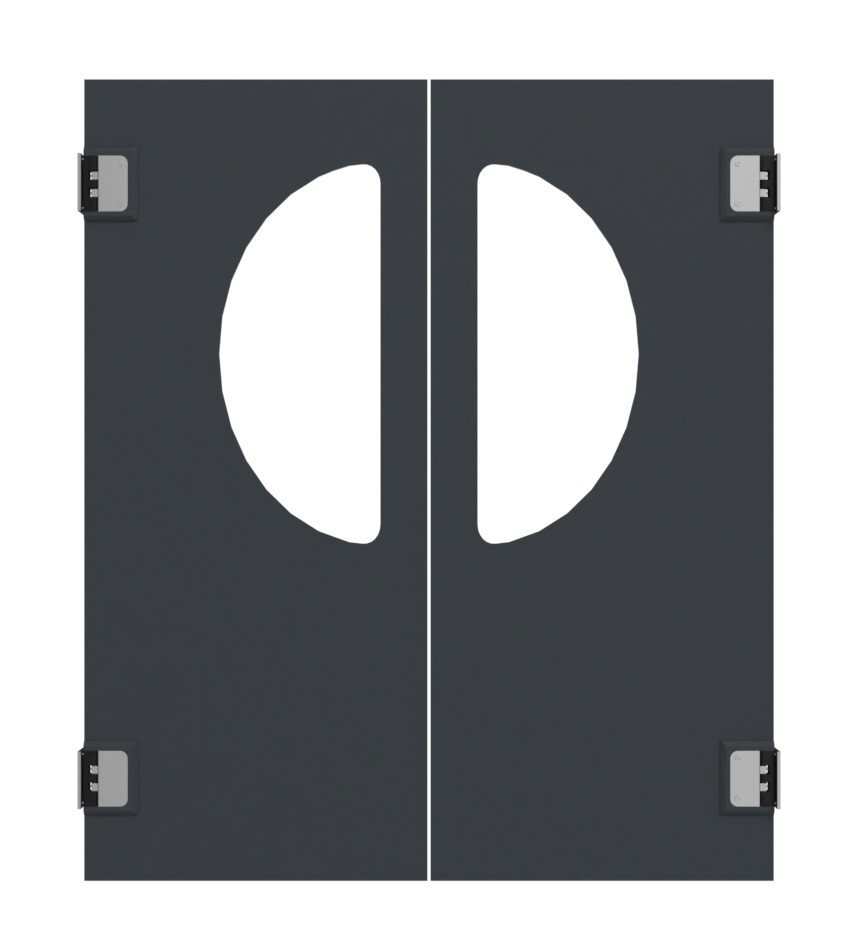 Materiał drzwi wahadłowych jest solidny, ponieważ składają się z łamliwego polietylenu o grubości 15 mm. Krawędzie są zaokrąglone. Zintegrowane szklenia akrylowe również mają grubość 15 mm i są wbudowane na równi z powierzchnią.