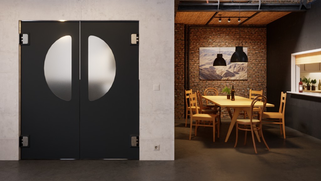 Drzwi produkowane są standardowo w RAL 7016. Na życzenie i za dodatkową opłatą możesz wybrać inny kolor powierzchni. Półokrągłe otwory szklane zapewniają jasność i jednocześnie pozwalają zajrzeć do drugiego pomieszczenia.
