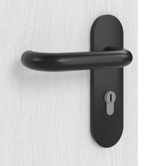 Następujące komponenty są już zawarte w standardowej wersji drzwi: zamykacz nożycowy, czarny uchwyt przeciwpożarowy z tworzywa sztucznego, zamek cylindryczny oraz dwa trójczęściowe zawiasy.