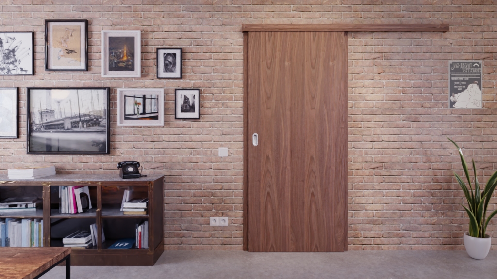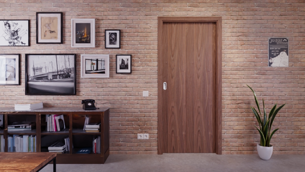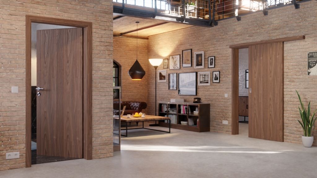 Drzwi z powierzchnią fornirową, w tym rowek prowadzący podłogę: