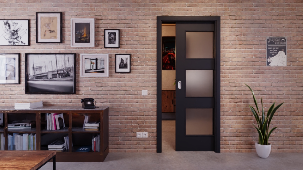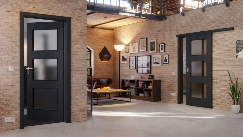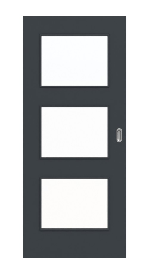 W skrzydle drzwiowym znajdują się trzy duże przeszklenia. Wysokiej jakości lakier w kolorze antracytowym zapewnia doskonały blask.
