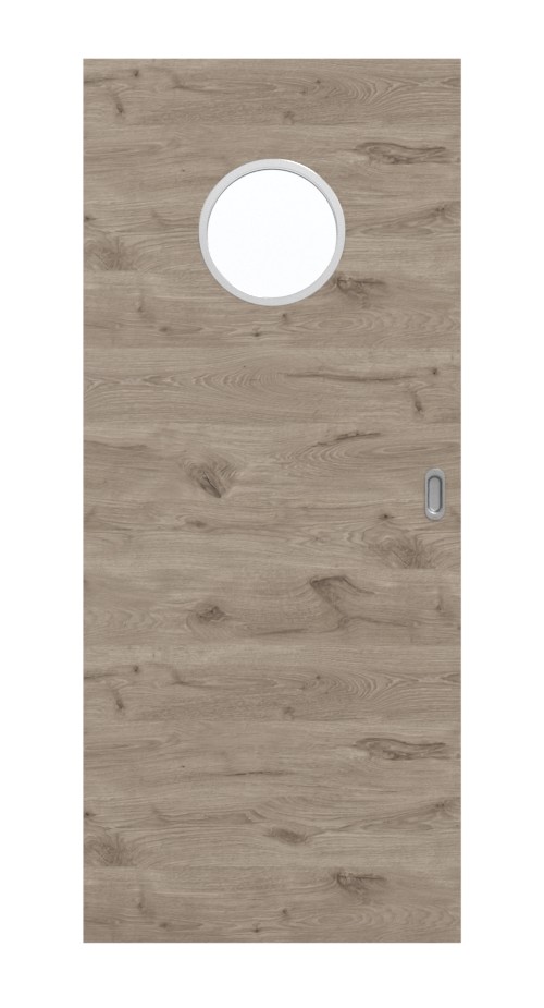 Wysokiej jakości drzwi przesuwne LA Bullauge w kolorze dąb północny wzdłuż z uchwytem wpuszczanym muszlowym.