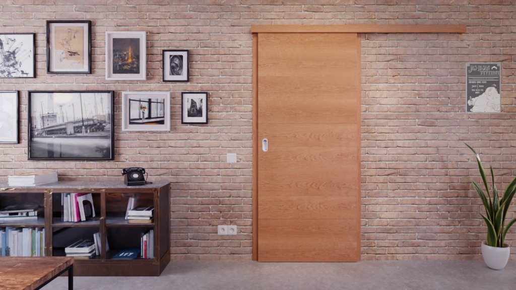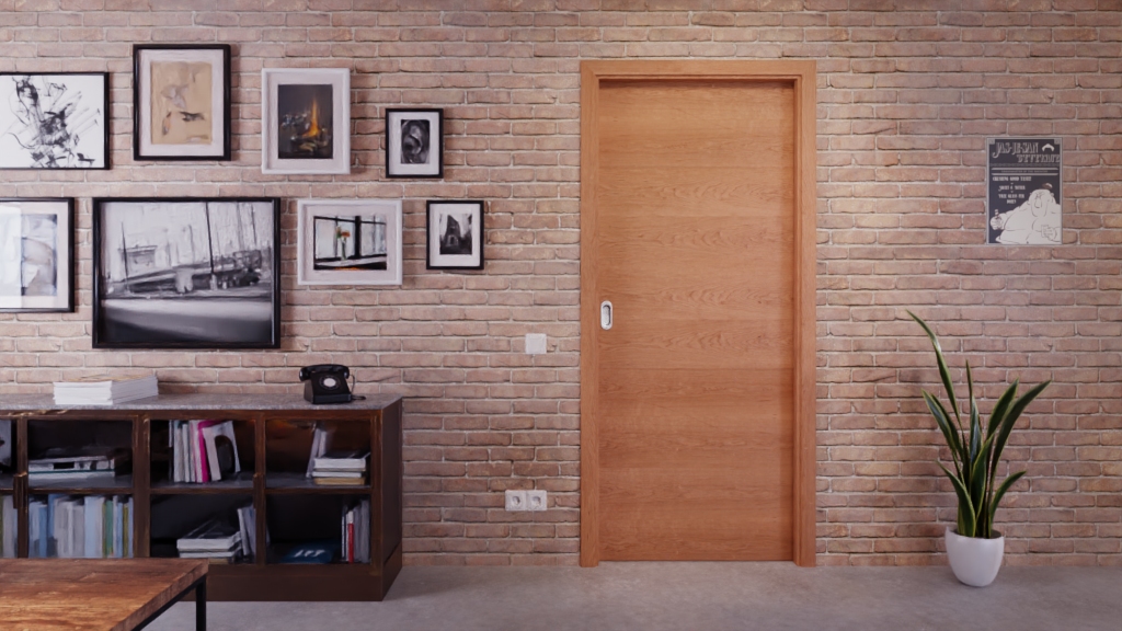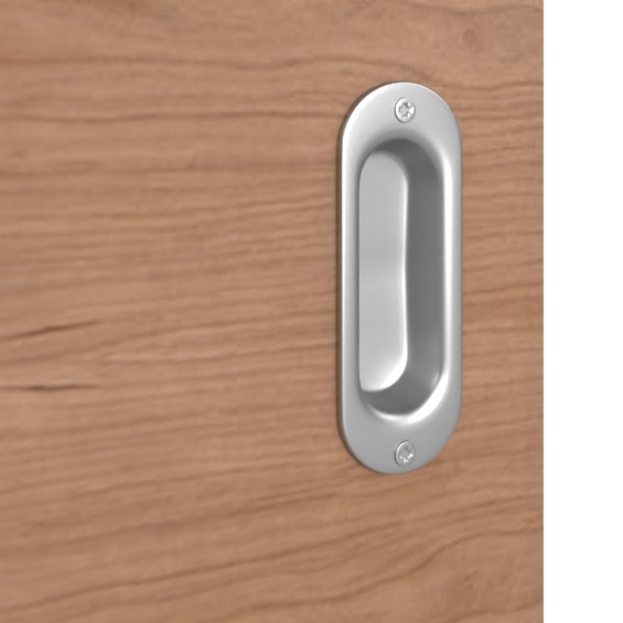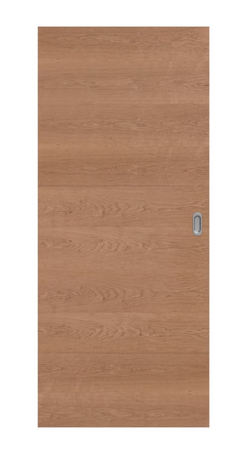 Drzwi pokryte fornirem drewnianym z owalną klamką: