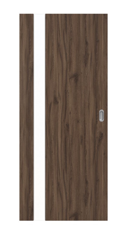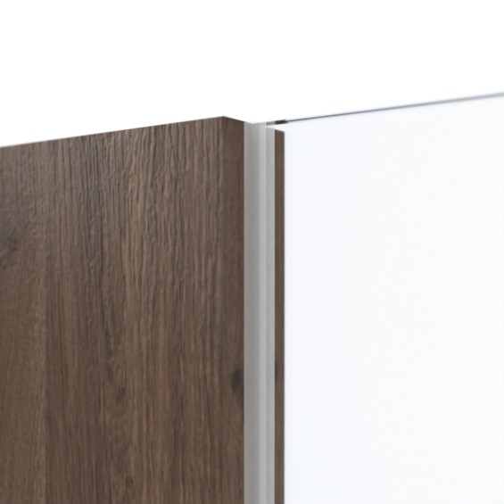 Ciemy odcień drewna wprowadza przytulność i tworzy zapraszającą atmosferę. Do naturalnej powierzchni dołącza elegancka listwa świetlna na całej wysokości skrzydła drzwi po stronie zawiasów.