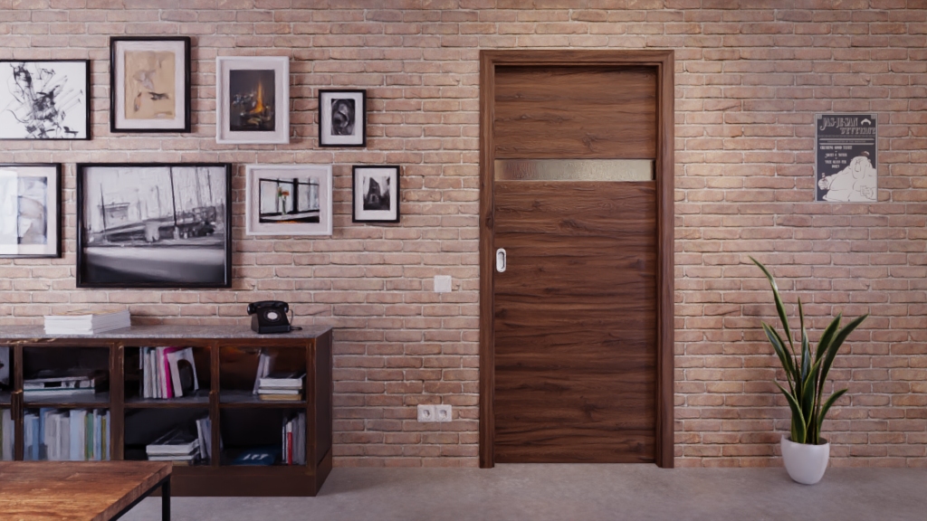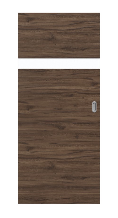 ciemny kolor drewna w poziomej optyce emanuje spokojem i tworzy przytulną atmosferę. Na wysokości oczu znajduje się wąski pas świetlny wbudowany na całej szerokości drzwi.