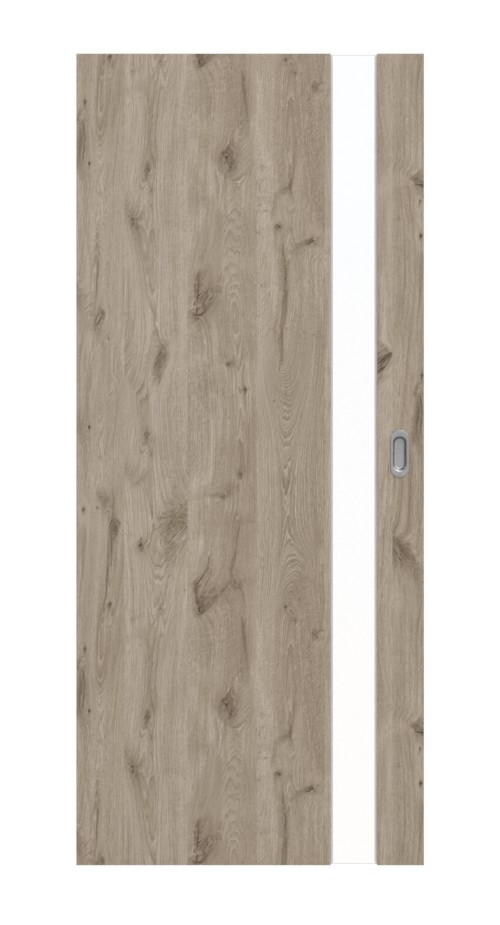Widoczne słoje nadają skrzydłu drzwi unikalny charakter. Po stronie zamka znajduje się podłużny pas świetlny.