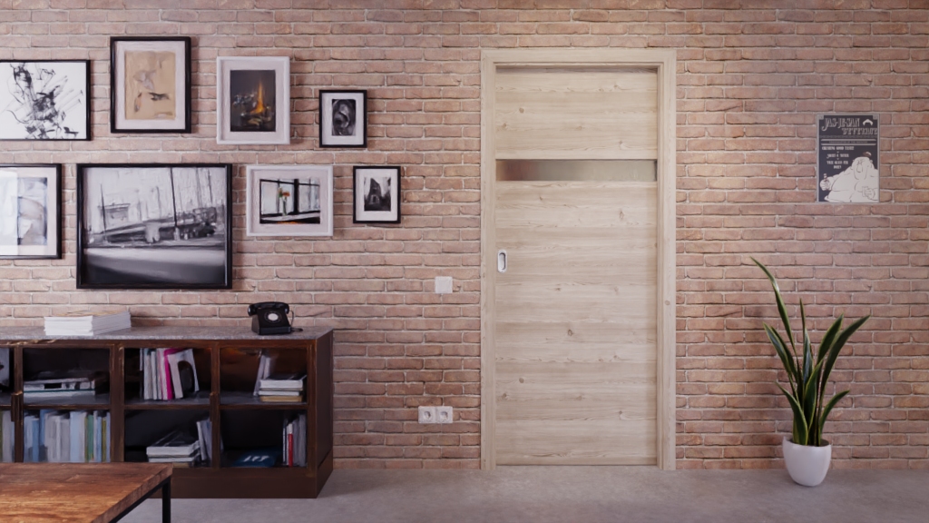 Trwałe i indywidualne drzwi przesuwne Pure 1 wzdłuż w modrzew jasny wzdłuż