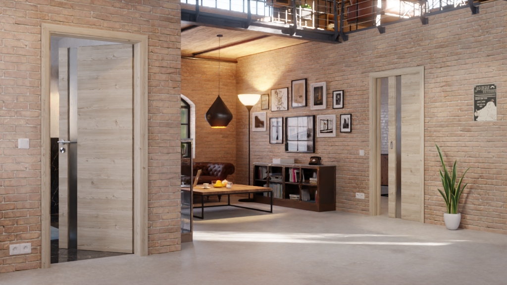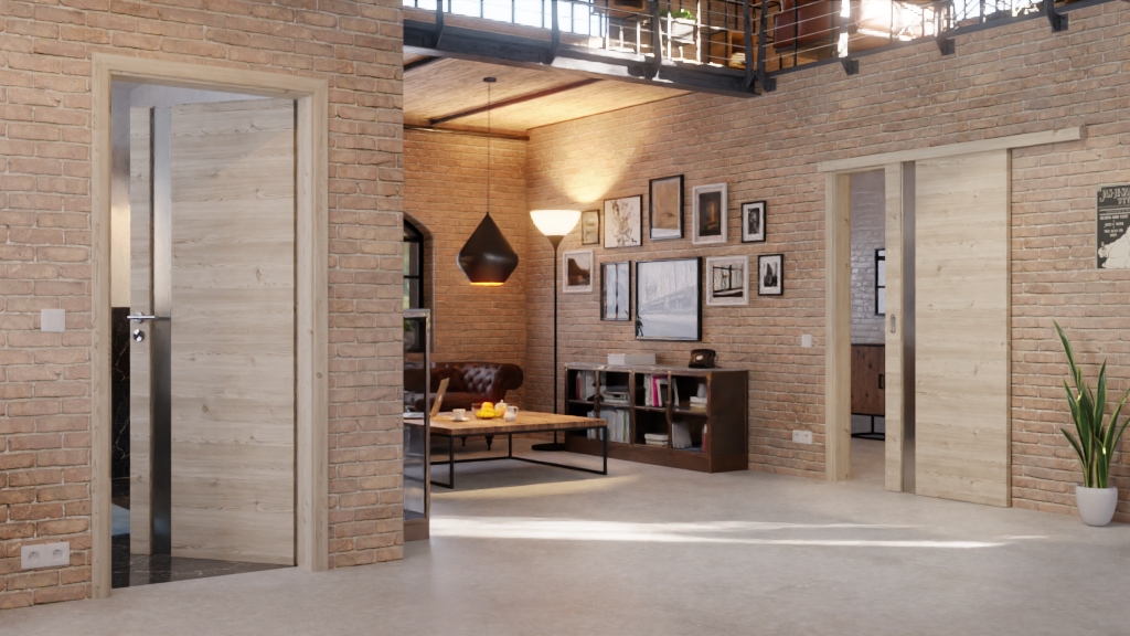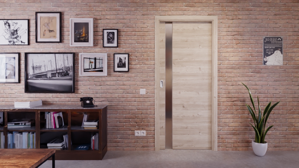 Drzwi przesuwne Pure 1 w kolorze modrzew jasny wzdłuż dla indywidualnego domu