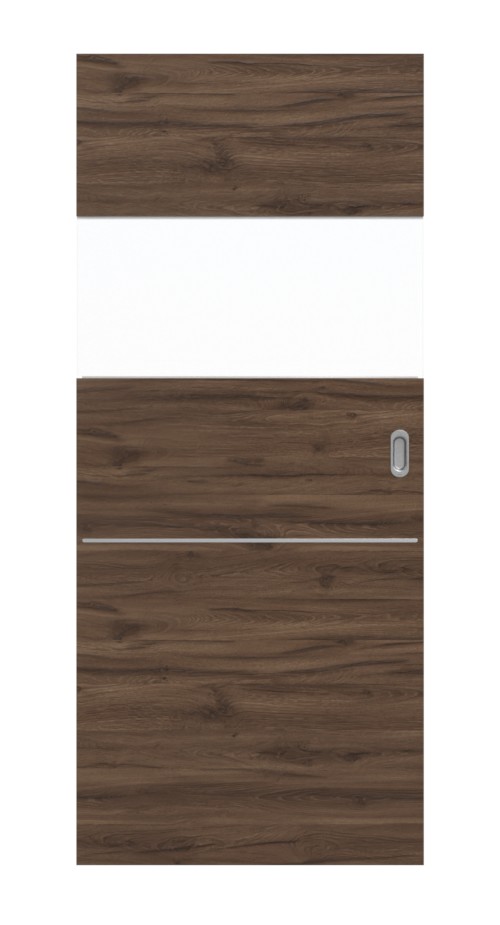 ciemny kolor drewna w poziomej optyce emanuje spokojem i tworzy przytulną atmosferę. Na środku znajduje się aplikacja ze stali nierdzewnej biegnąca w poziomie przez skrzydło drzwi. Zapewnia to indywidualny i elegancki design. Dzięki pasowi świetlnemu na wysokości oczu do Twojego domu wpada dużo światła.