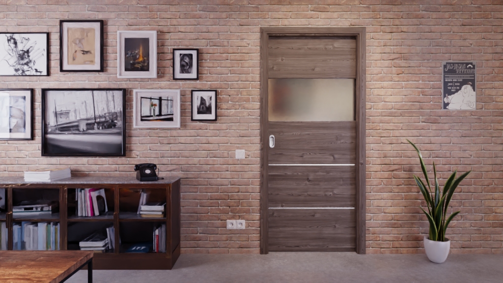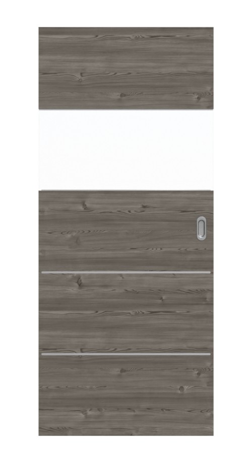 Ciemny odcień drewna w układzie poziomym zamienia Twoje pomieszczenie w oazę relaksu. Pas świetlny na wysokości oczu zapewnia dobrze oświetlone wnętrza. Obie aplikacje ze stali nierdzewnej w dolnej części skrzydła drzwi nadają elegancki i indywidualny wygląd.
