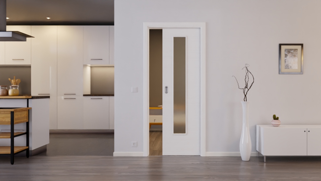 Trwałe drzwi przesuwne ProLine w szczotkowanej bieli z pełną płytą, która zapewnia stabilność: