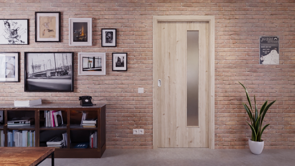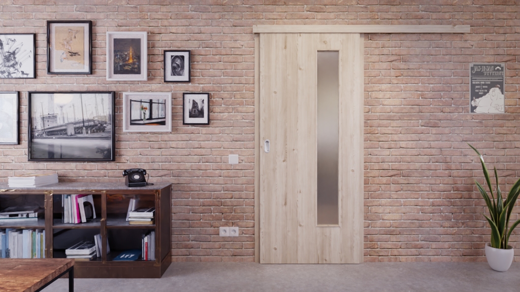 Oszczędzające miejsce drzwi przesuwne LA-24 w jasnym modrzewiu z przeszkleniem.