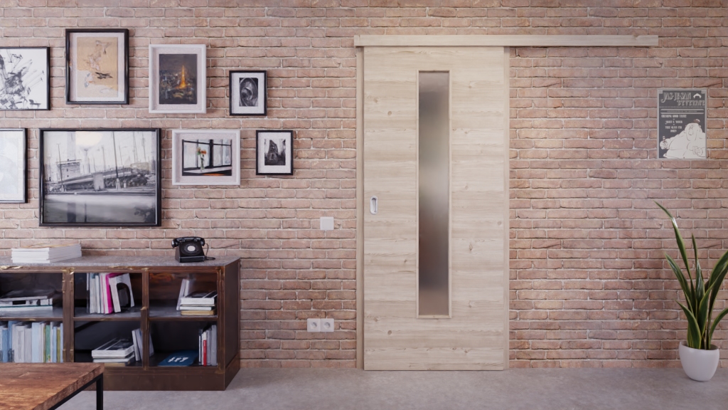 Praktyczne drzwi przesuwne LA-24 w jasnym Cross-modrzewiu z rowkiem prowadzącym