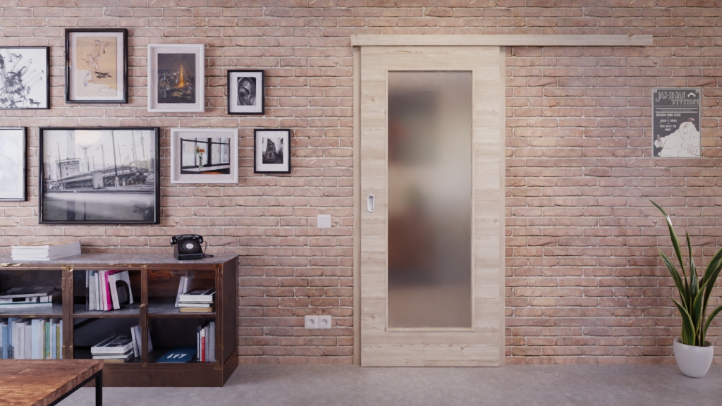 Robustne drzwi przesuwne ProLine w jasnym szczotkowanym modrzewiu poziomo z stabilizującą płytą pełno-włóknistą: