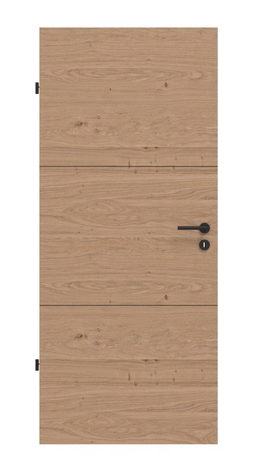 Wewnętrzne drzwi fornirowane w dębie o poprzecznych słojach z zawiasami, zamkiem i płytą wiórową: