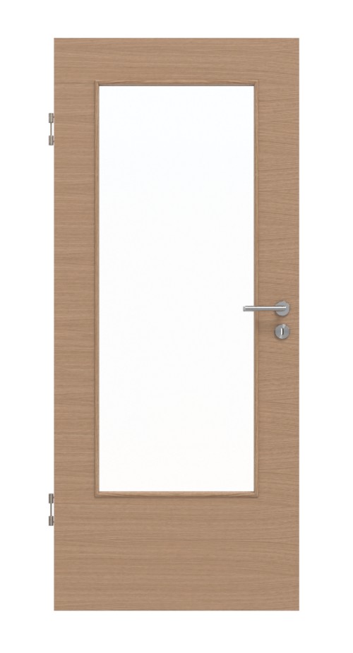 Drzwi o grubości 40 mm mają solidne rdzeń z płyty wiórowej, co zapewnia wysoką trwałość. Model ma kwadratowe krawędzie. Standardowy zestaw dostawy zawiera dwa 3-częściowe zawiasy oraz zamek wielozadaniowy.